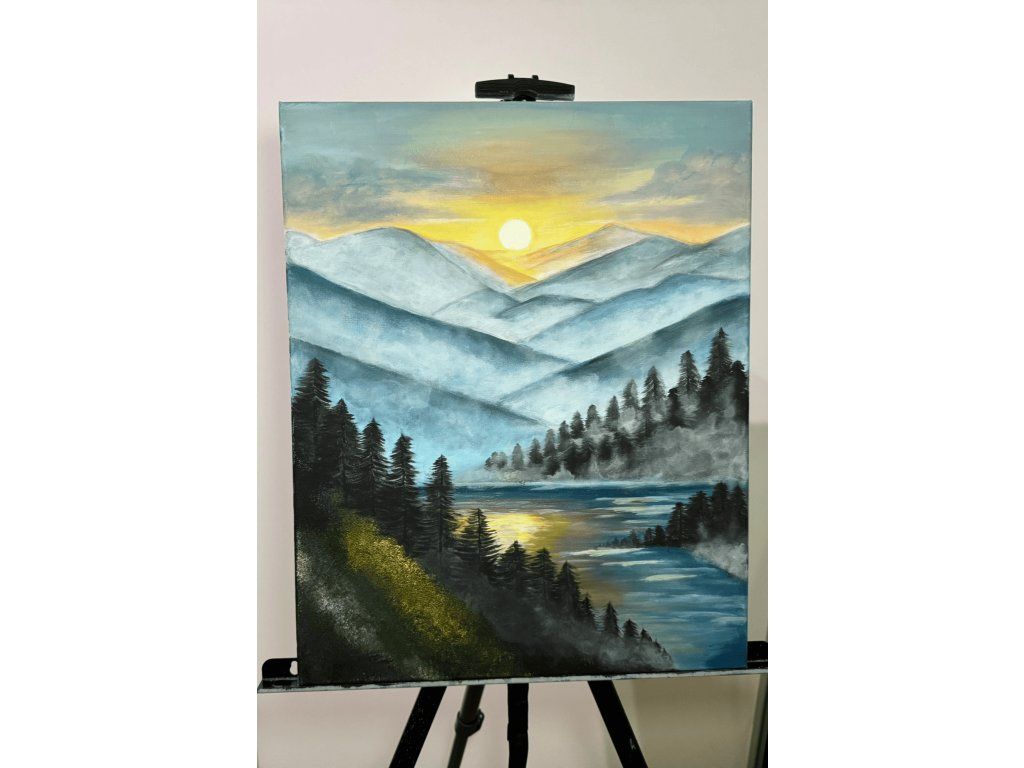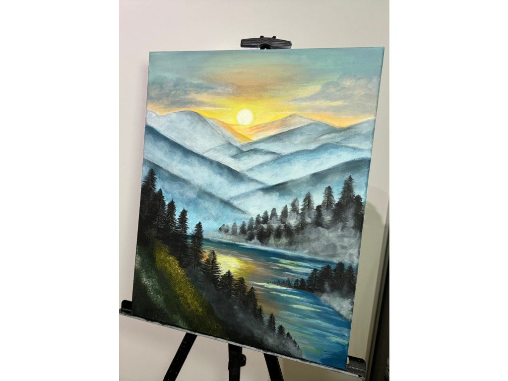 Obraz jsem malovala 11 hodin. Byly použity akrylové barvy a lesk na vodní plochu i Slunce. Rozměry plátna jsou 40 x 50 cm a jeho gramáž je 280 g/m².