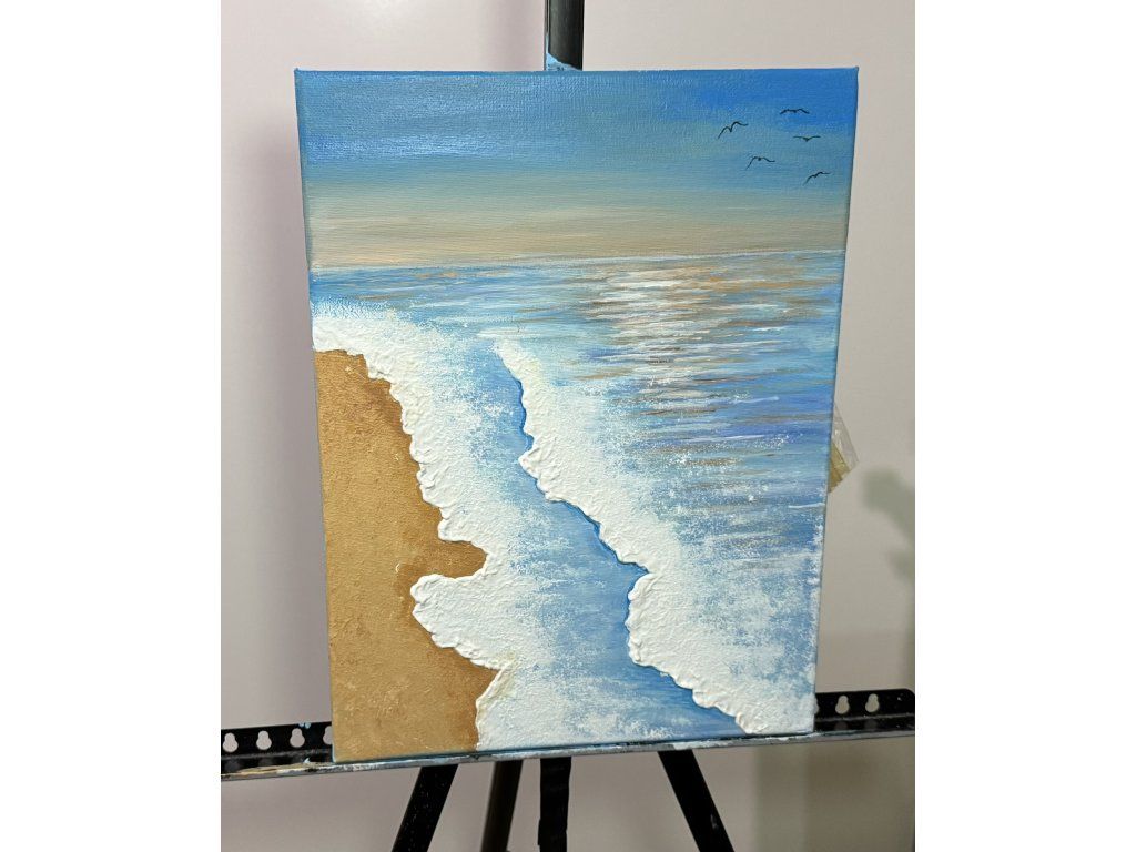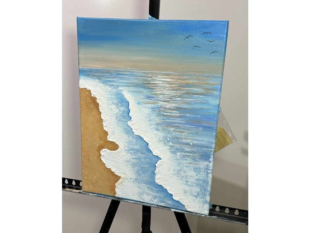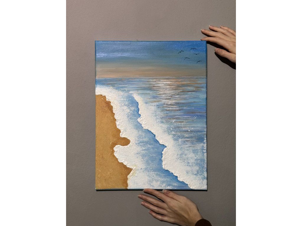 Obraz jsem malovala 7 hodin. Byly použity akrylové barvy a lesk na vodní plochu i nebe. Rozměry plátna jsou 30 x 40 cm a jeho gramáž je 290 g/m².